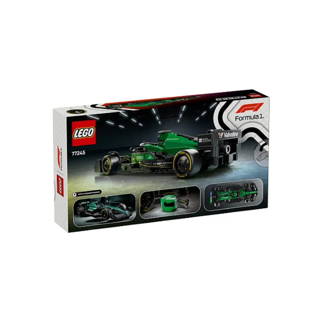 O carro de corrida Aston Martin Aramco F1 apresenta um cockpit que abre levantando a barra de halo, uma asa traseira, suspensão wishbone, adesivos de patrocinadores e pneus traseiros mais largos com a inscrição “Pirelli”. O kit do veículo vem com uma minifigura de piloto em uma roupa Aston Martin Aramco F1 e um capacete alado para colocar dentro do cockpit e nas corridas de palco.